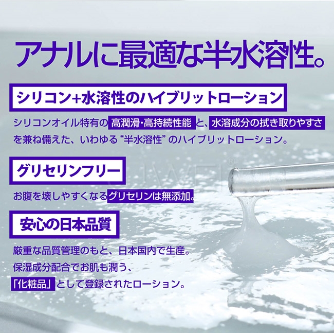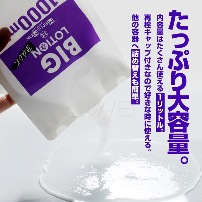 衛生管理を徹底した化粧品認可取得工場で製造された国産ローション。 内容量はたくさん使える1000ml。 メンズマックスのビックローションシリーズにアナル専用(BACK)が登場! コスパも良く詰め替えにも最適な大容量1000mlは使いやすく保管用としても便利です。 アナル用として製造されたバックローションは品質にも拘った化粧品グレード。 シリコンベースで持続性抜群なのに簡単にサッ! っと拭き取れるウォーターベースのような使いやすさは、このバックローションならではの特徴です。 16mmの大口径キャップですばやく注げます。 業務用にもおすすめの商品です。 1000ml