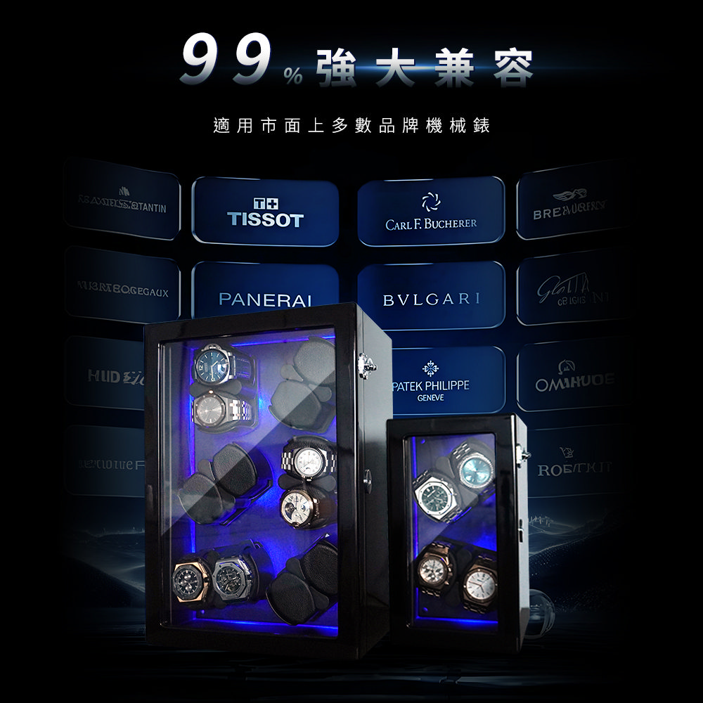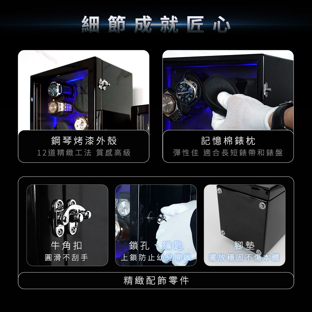 這款機械錶上鏈盒專為錶迷設計,結合功能性與美觀性,完美適用於居家使用或店家展示。擁有五種上鏈旋轉模式,滿足各類機械錶的需求,搭配靜音防磁設計,確保在安靜環境中穩定運行,無需擔心磁場干擾。高級鋼琴烤漆外觀散發典雅質感,內置LED展示燈,更添高級氛圍。開蓋自動停止旋轉功能,便捷實用。內建簡易鑰匙上鎖系統,提供額外的安全保障。供電方式靈活,可插電或使用電池,適合各種情境下使用,讓您的機械錶隨時保持完美運轉。