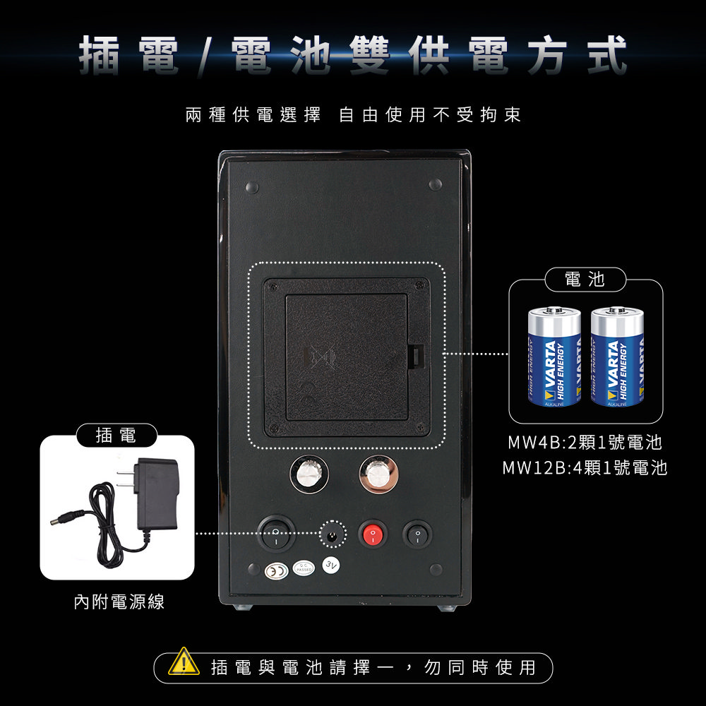 -供電方式可插電或裝電池擇一。