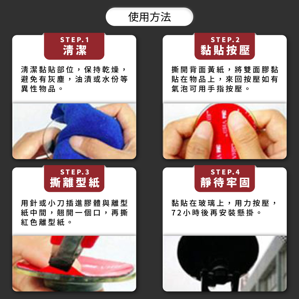 註:黏貼時請避免手指碰觸雙面膠帶黏著面,以免手指油脂降低膠帶黏著性。