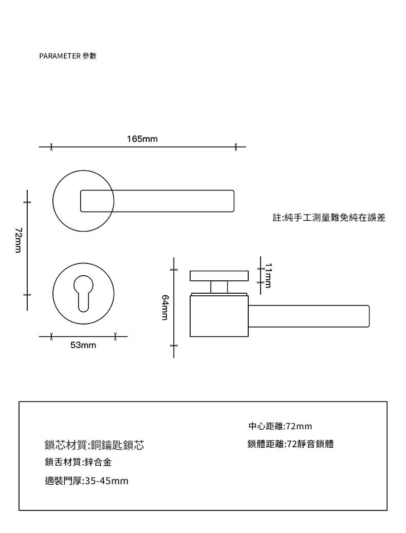 - 尺寸規格:有具體尺寸參數,中心距離為 72mm,適裝門厚 35 - 45mm 。