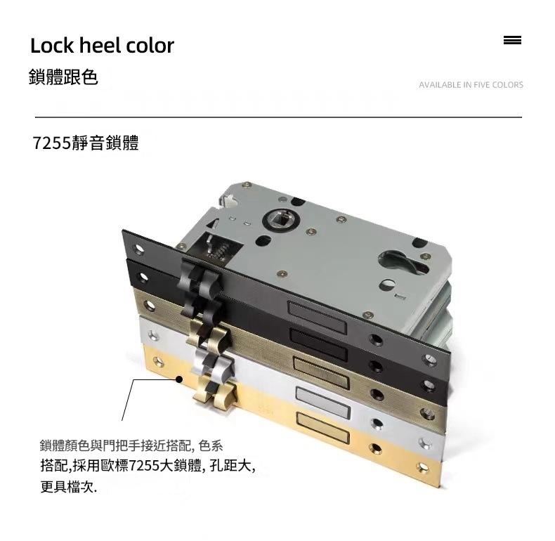 • 鎖體:屬於 7255 靜音鎖體,採用歐標規格,孔距大,整體品質與檔次較高,且有多種顏色可選,能與門把手接近搭配,實現和諧的色系搭配。