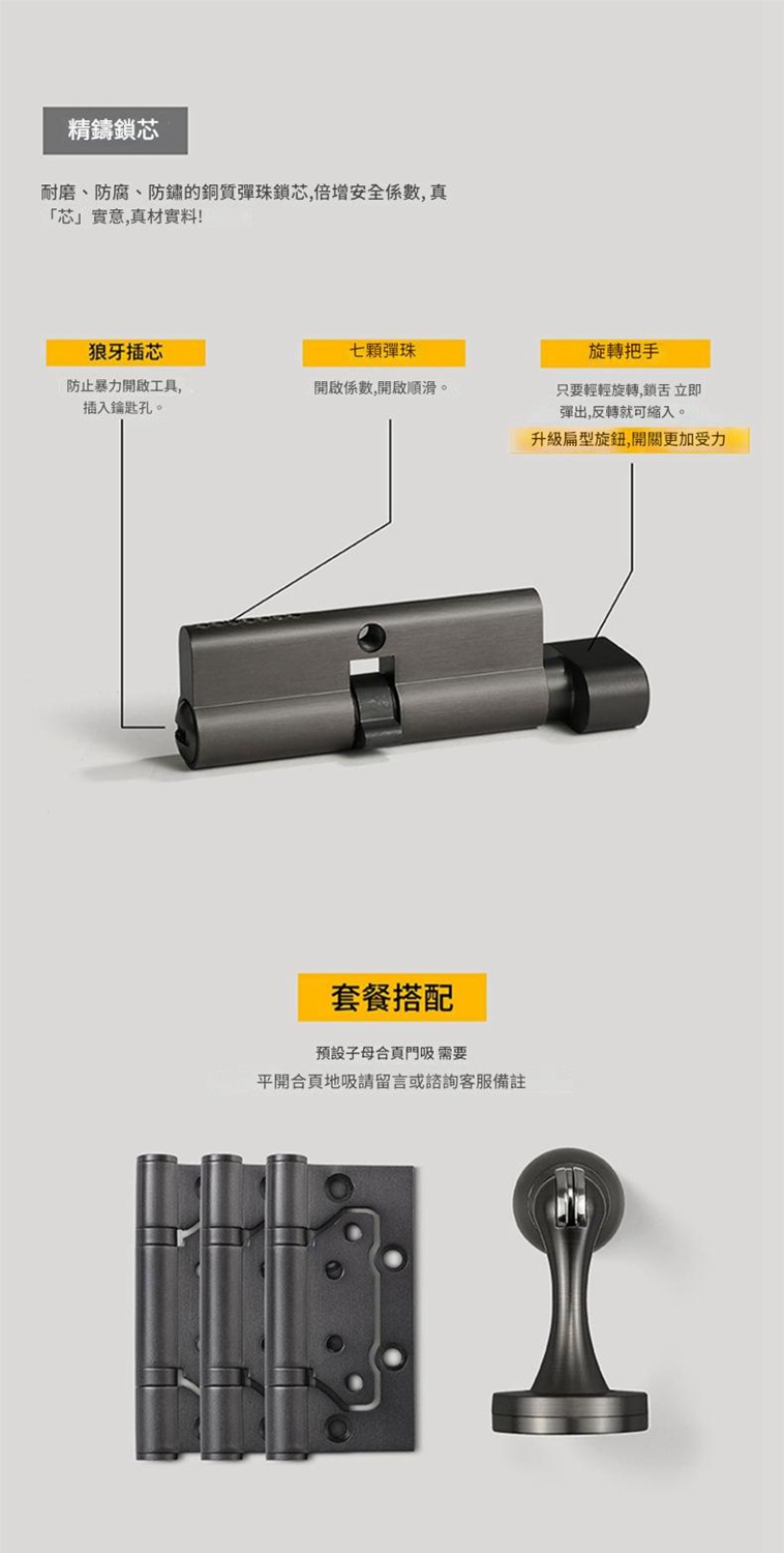 - 鎖芯:採用銅鑰匙鎖芯,耐磨、防腐、防鏽性能優異,搭配狼牙插芯與七顆彈珠設計,既能防止暴力開啟工具插入鑰匙孔,又能讓開啟過程順滑流暢,安全係數高。