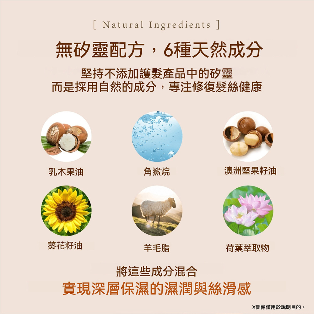 ◎無矽天然護髮配方,特別不添加容易帶來質感的矽成分,而是以天然來源的成分修護頭髮,實現豐潤的保濕感和順滑的手感。