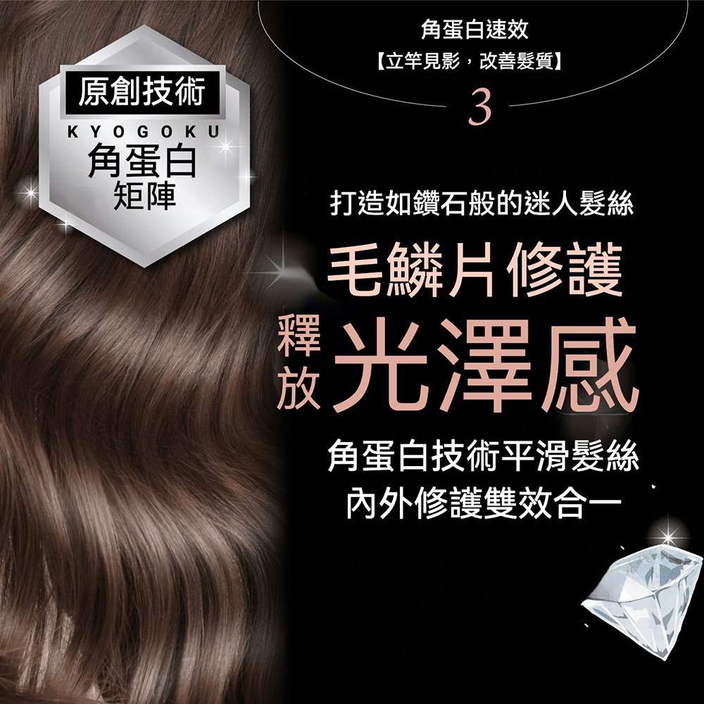 ◎搭配同系列的KYOGOKU角蛋白洗髮精和這款角蛋白護髮素,七種角蛋白在髮絲內部和表面複雜地交織,不僅能強化髮質,還能實現所需的光澤和柔順效果。包括生角蛋白/羊毛角蛋白/羽毛角蛋白/開司米角蛋白/表皮角蛋白/油性角蛋白/矽化角蛋白