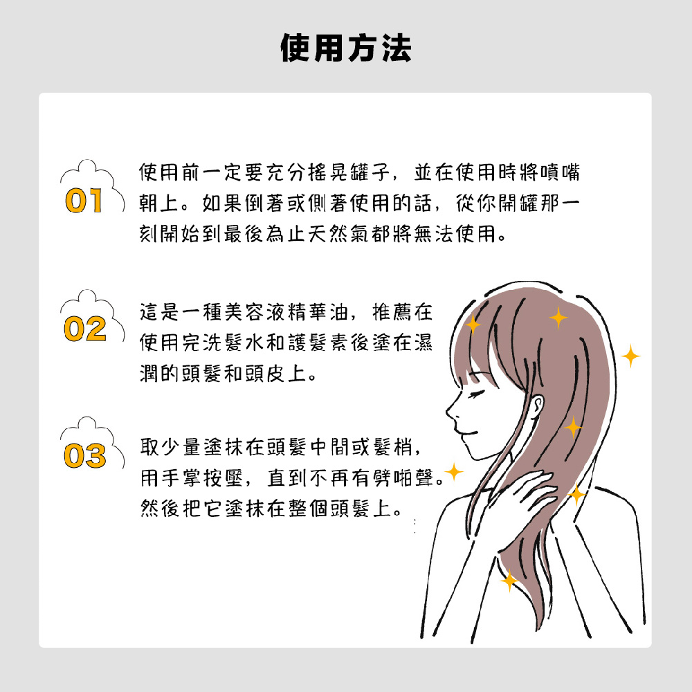 3️⃣ 吹風機前使用,形成保護膜,有效抵禦熱風損傷,讓髮絲更加柔順閃亮!