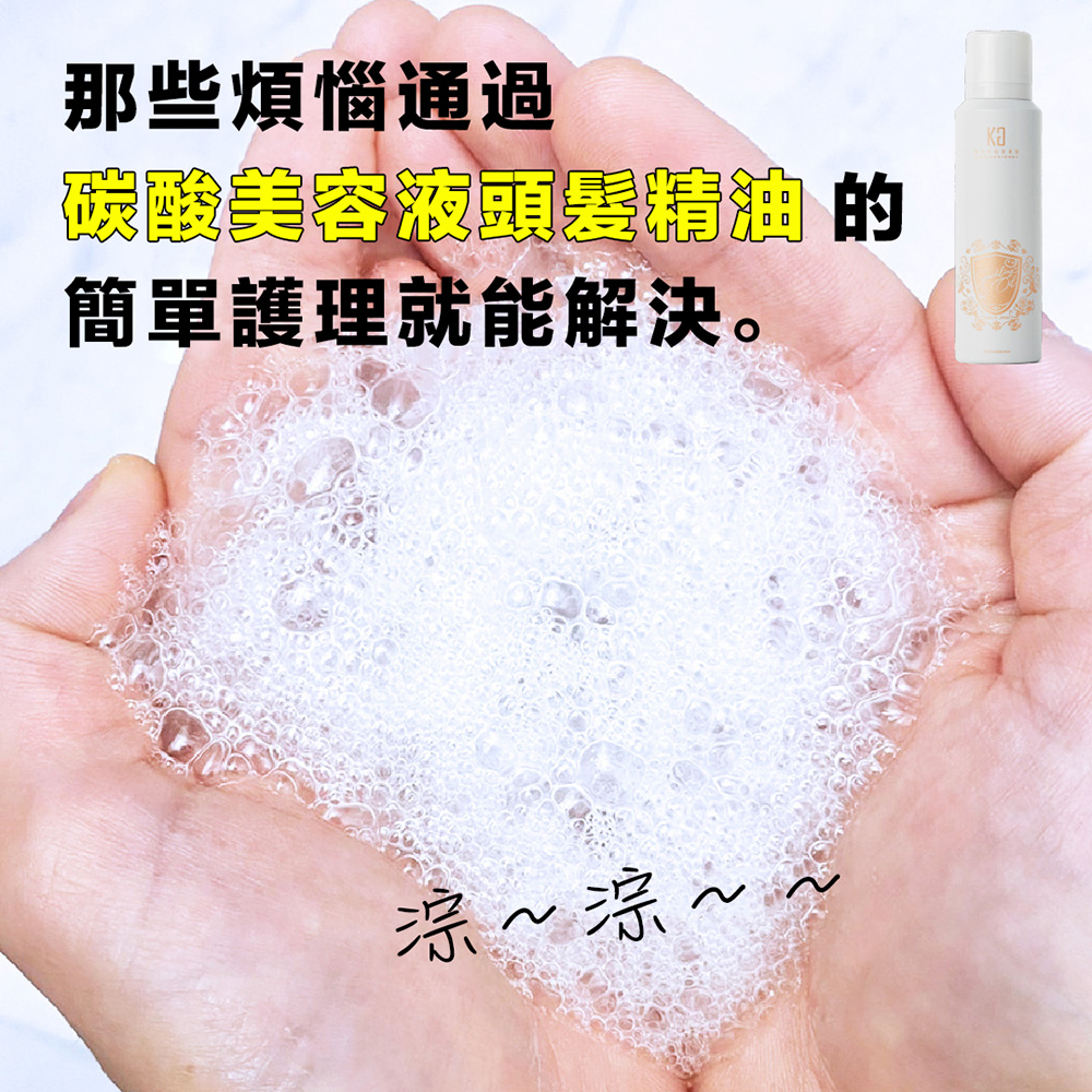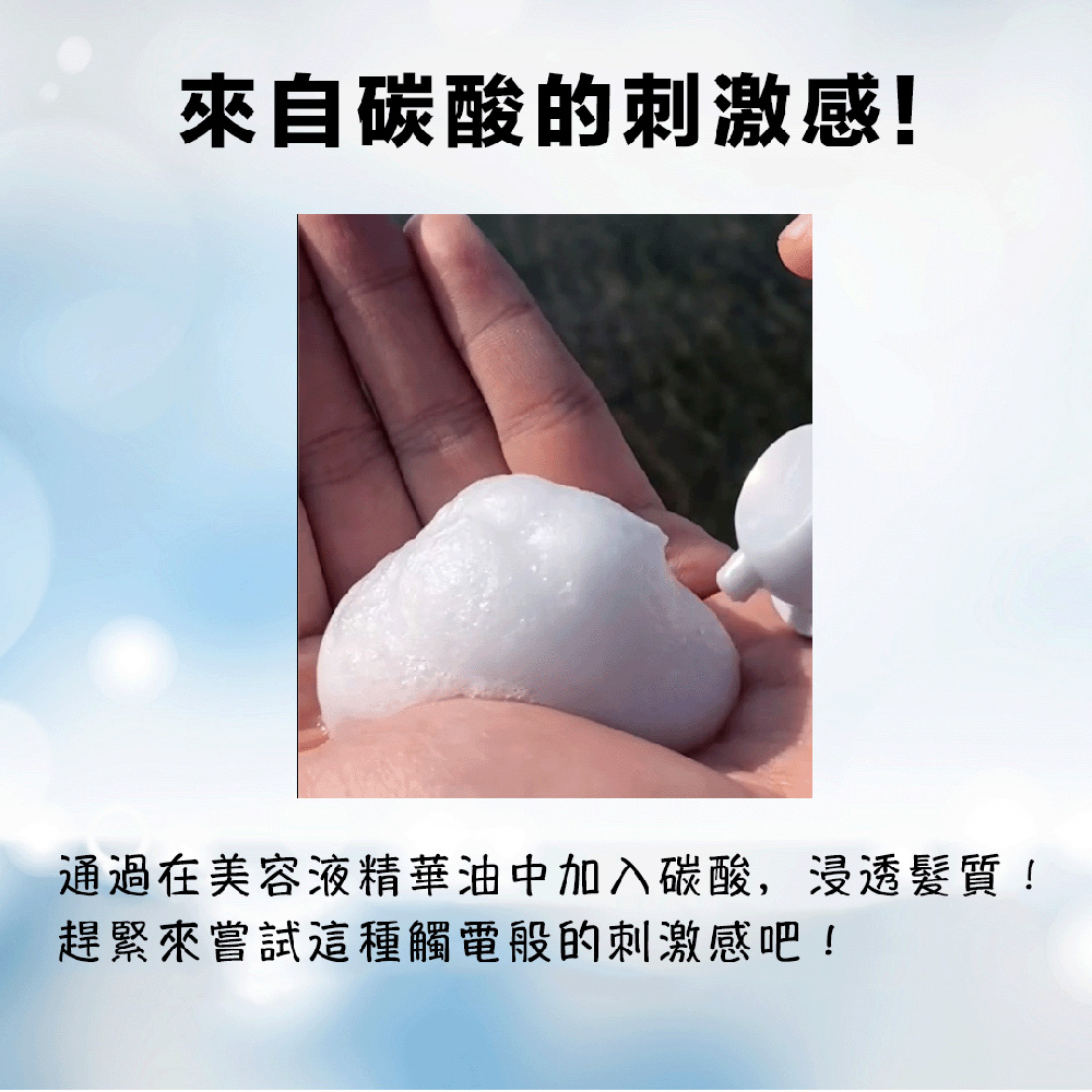 碳酸(二氧化碳)具有擴張毛孔的效果,幫助美容成分滲透至頭皮和髮絲深處,大幅提升養分吸收力,讓護理效果更加顯著。