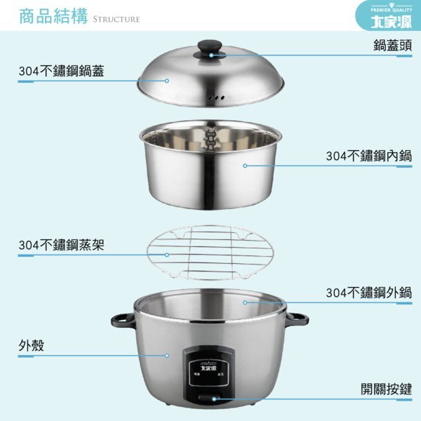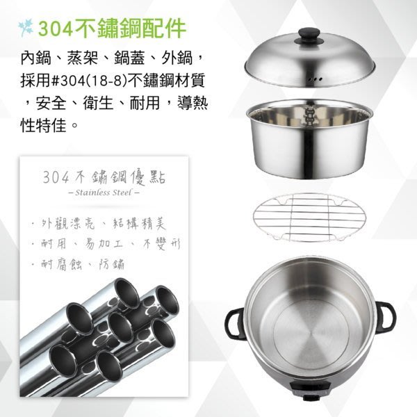 1.內鍋、蒸架、鍋蓋、外鍋,採用#30418-8不鏽鋼材質,安全衛生耐用。