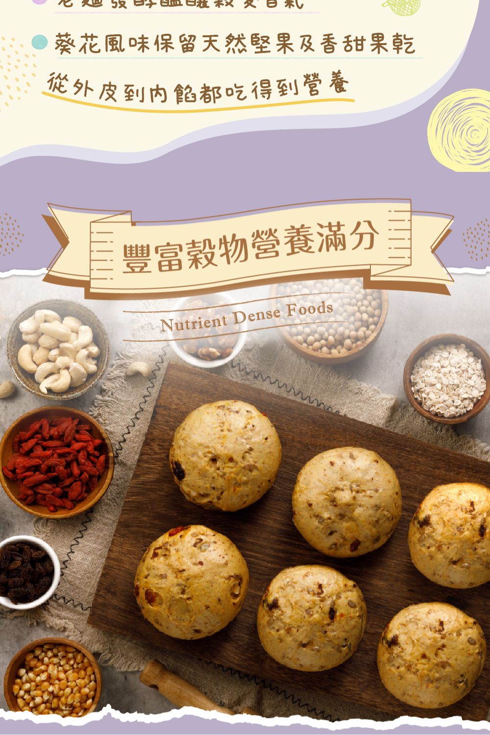 大麥燕麥添加葵花多穀雜糧,包入多種豐富堅果及果乾,新鮮葡萄乾、葵花子、枸杞、核桃、南瓜子、腰果等,提供多元營養的成分,口感紮實Q彈有嚼勁。