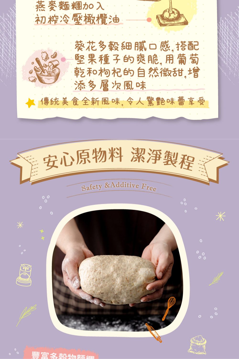 商品成分:麵粉、水、葵花多穀雜糧粉(小麥、葵花籽、燕麥、玉米(非基改)、亞麻仁籽、裸麥、馬鈴薯、香料(胡荽、咖哩))、大麥燕麥雜糧粉(小麥、燕麥、大麥、玉米(非基改)、葵花籽、亞麻仁籽、糙米、芝麻、黃豆(非基改)、薑黃)、葡萄乾、葵花子、枸杞、核桃、特級冷壓橄欖油、南瓜子、腰果、自養新鮮酵母。