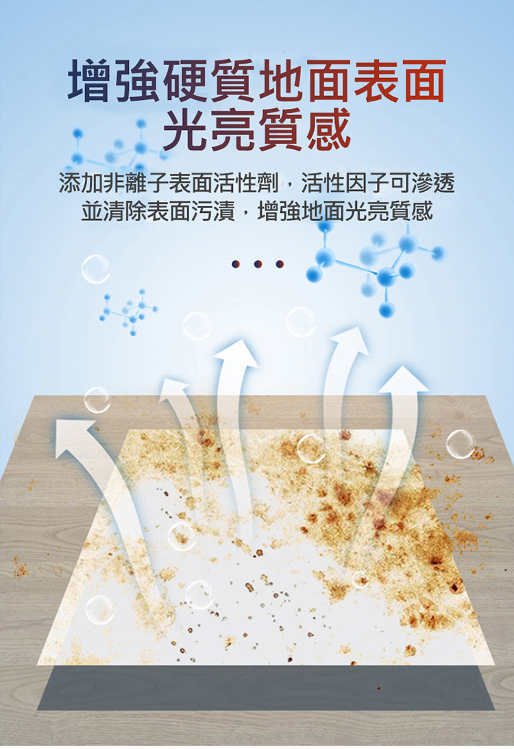 ▼潔淨配方,有效提高除污效果,不傷地板,增加地面光亮。有效除菌抑菌,減少細菌滋生。
