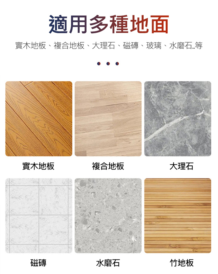 ▼適用於家庭環境中多種表面清潔~實木地板、複合地板、大理石、磁磚、玻璃、水磨石石英地板等材質。
