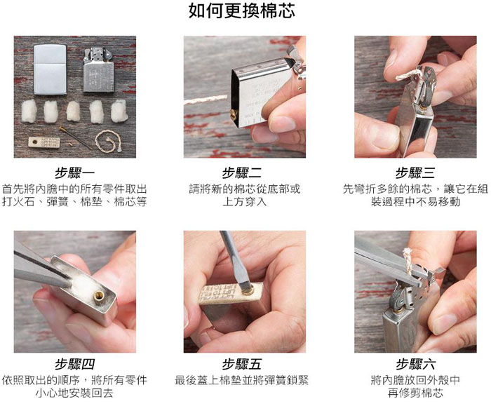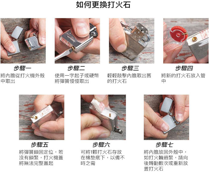 建議使用 Zippo 原廠專用油、火石及棉芯。