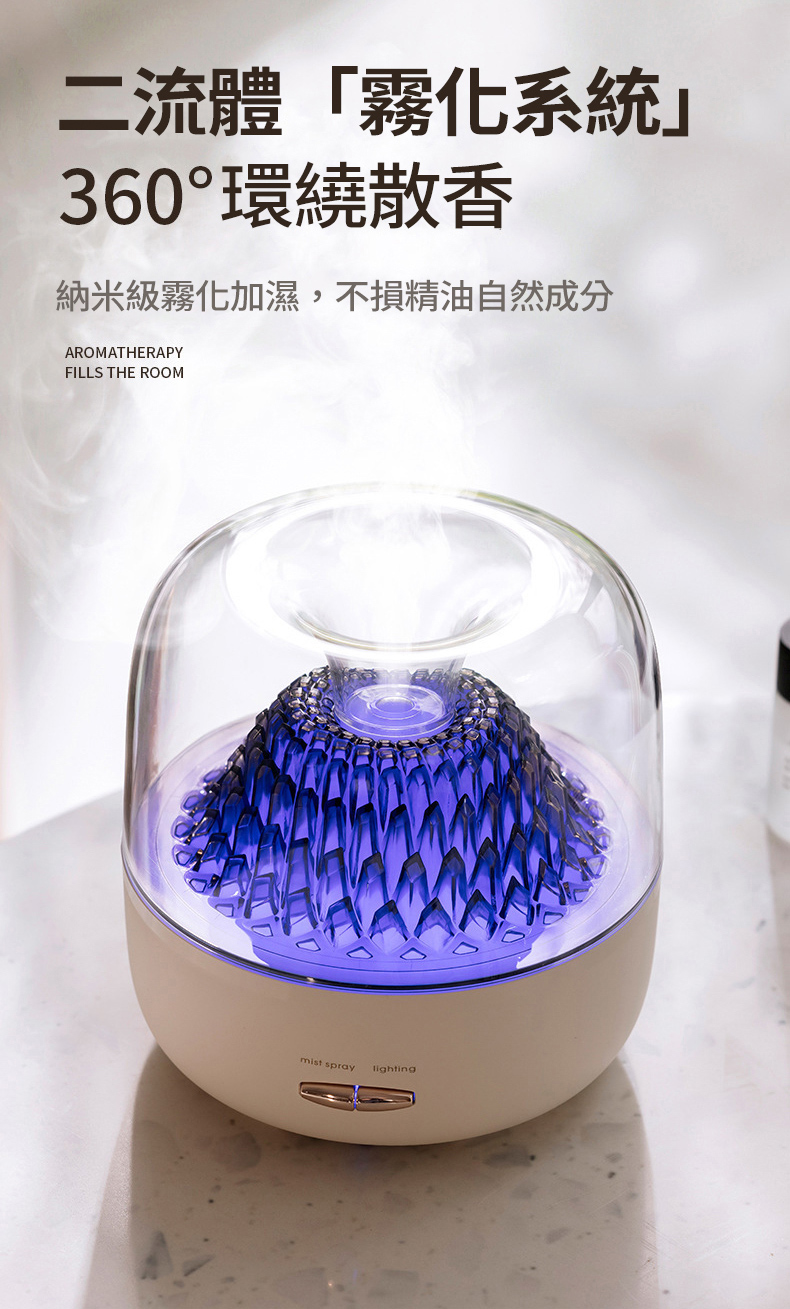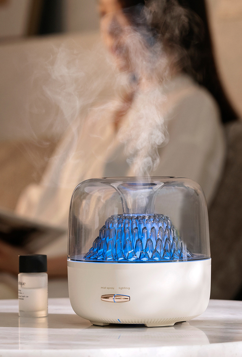 宛如冰山晶礦般的立體造型,結合精油擴香、超音波加濕與氛圍夜燈三合一功能,這款香薰水氧機將設計美感與實用機能完美融合。