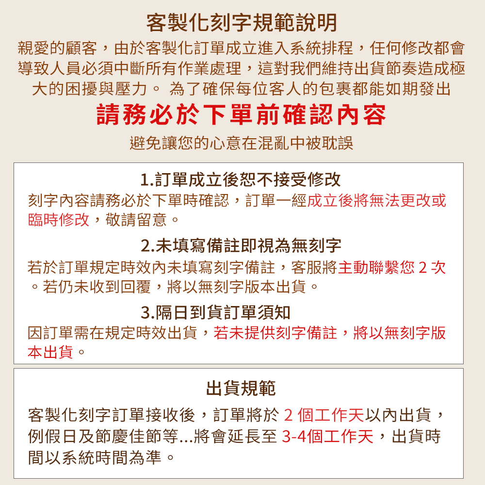 加購雷射雕刻服務需1-2個工作天,商品將於雷射雕刻完成後盡速為您寄出,
